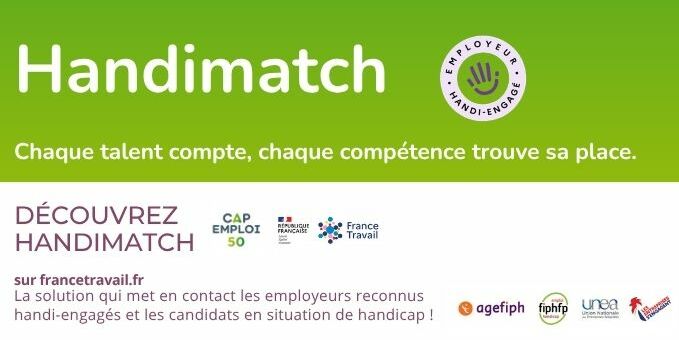 Issu des mesures de la 6ᵉ Conférence Nationale du Handicap (CNH), ce dispositif nationale, s’inscrit pleinement dans la dynamique de transformation inclusive du marché du travail. Handimatch est un dispositif développé en partenariat avec France Travail, pour faciliter la mise en relation entre employeurs engagés et candidats en situation de handicap.Rendre visibles les talents souvent “invisibles” et faciliter la rencontre entre les personnes en situation de handicap et les employeurs handi-engagés.