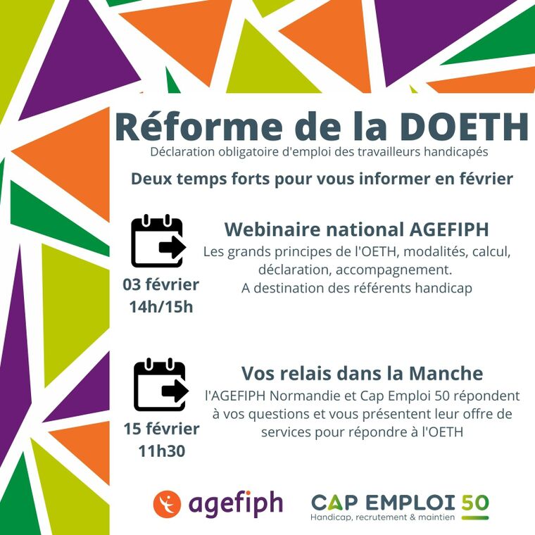 L’Agefiph Normandie et Cap Emploi 50 vous invitent à participer à un parcours de deux webinaires pour tout savoir sur la DOETH - Déclaration Obligatoire d'Emploi des Travailleurs Handicapés.